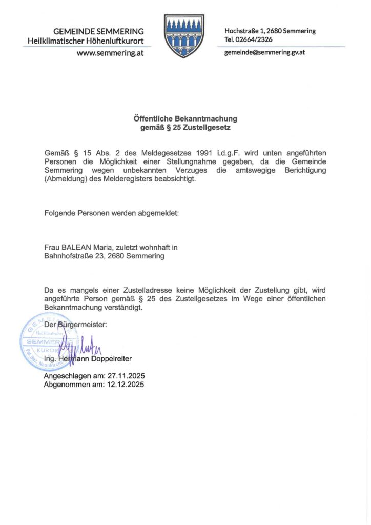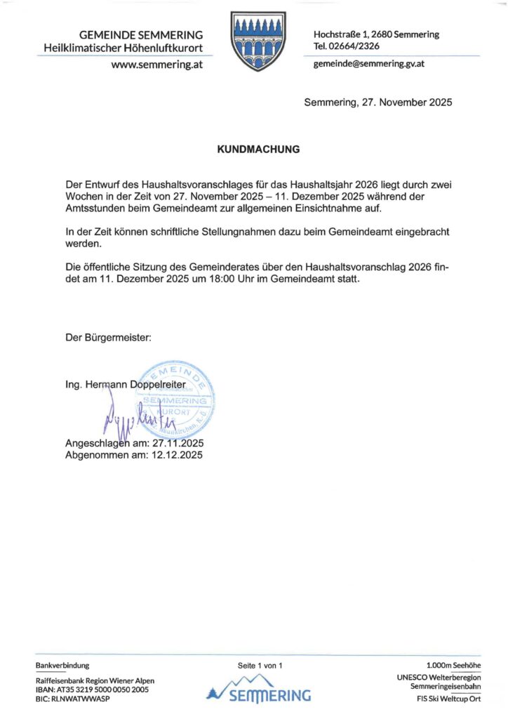 Amtstafel Stets am Laufenden beim Bürgerservice Kundmachung Haushaltsvoranschlag 2025 mehr Kundmachung Anberaumung gewerbebehördliche Verhandlung Sporthotel Semmering 5. Dezember 2025 mehr Kundmachung Anberaumung gewerbebehördliche Verhandlung Sporthotel Semmering 2. Dezember 2025 Mehr Kundmachung amtliche Abmeldung mehr Kundmachung und Informationen Geflügelpest Stand 24.11.2025 mehr mehr Ortspolizeiliche Verordnung mehr mehr Waldbrandverordnung mehr